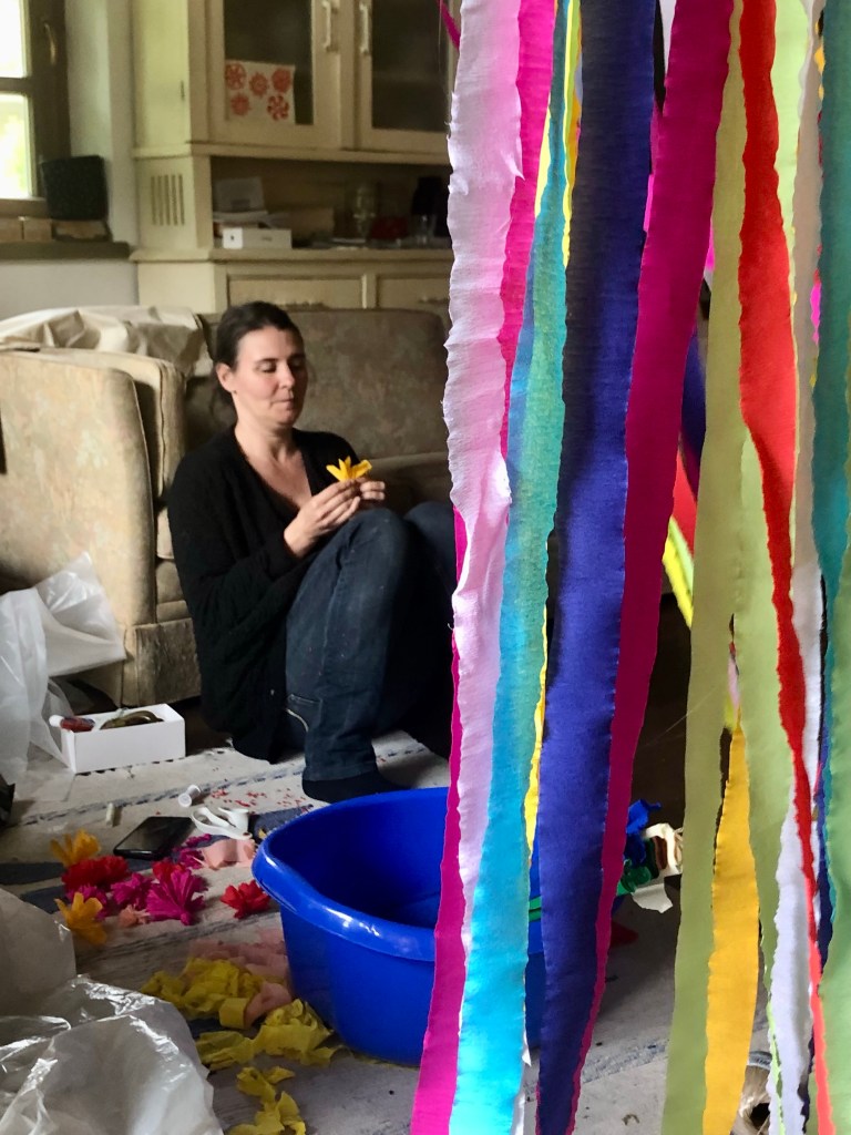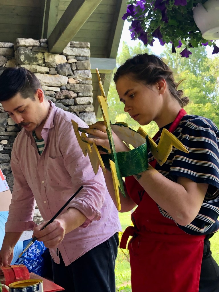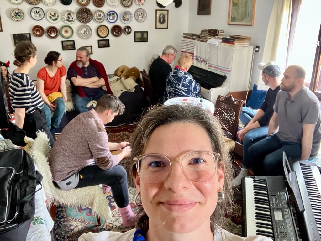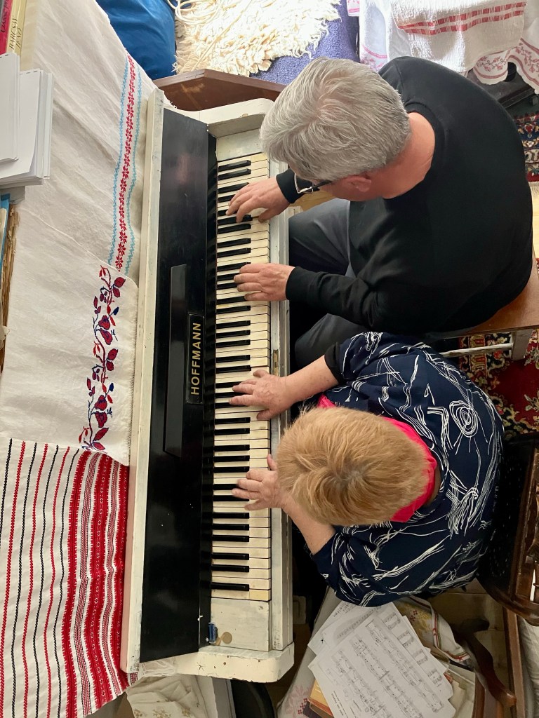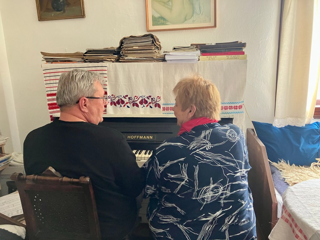 A végére hagytam a nap legmeghatóbb pillanatait. Zsóka néni elképesztő személyiség, nem unatkozunk nála egy percig sem. A hét folyamán mesélt nekünk Tibiről, a postásról, aki felnőtt emberként tanult meg zongorázni. Annyira megszerette, hogy nem elégedett meg az otthoni tanulással, ezért beiratkozott a tapolcai zeneiskolába. Itt helyben jól ismerik őt és történetét is, hiszen Zsóka nénivel időről-időre koncerteket adnak a környéken. Annyira lelkesedtünk a történetért, hogy délben zongora hang fogadott minket, mert Zsóka néni és Tibi minikoncerttel készültek nekünk! Leesett az állunk! Még hangfelvételt is készítettünk, hogy a felvonuláson a gurulós zenedobozból is felcsendüljenek a négykezesek!