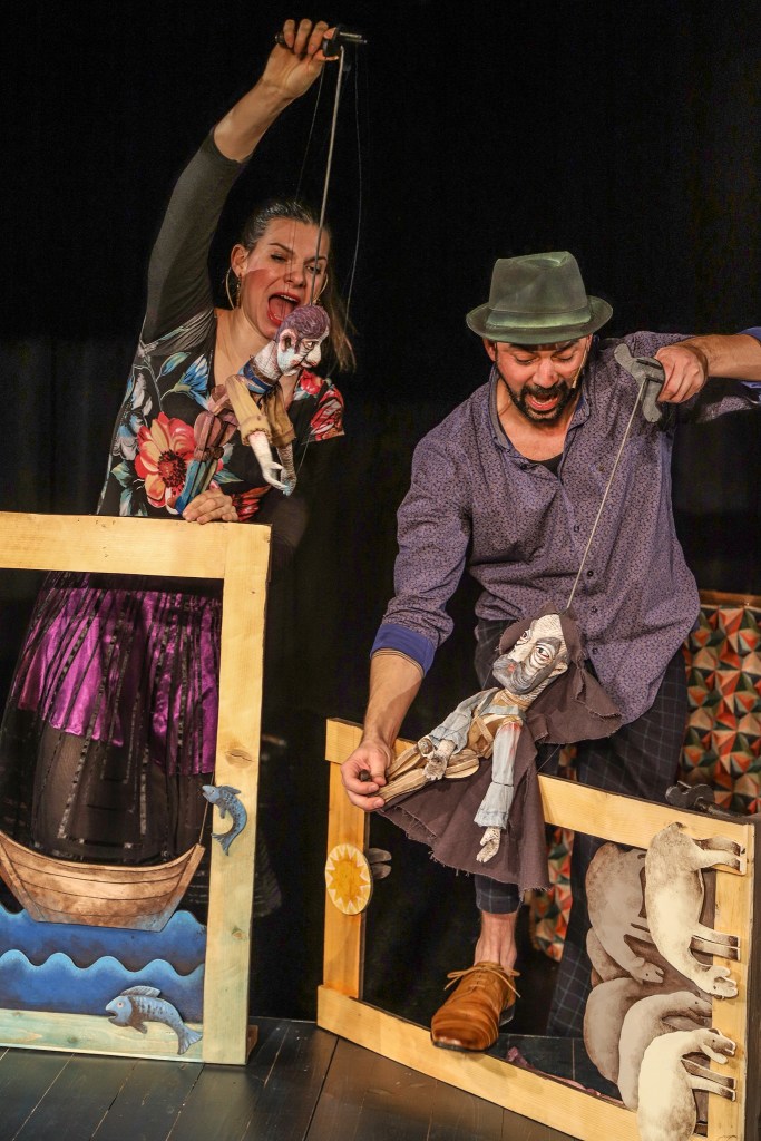 MVA: Nekem ez nagyon tetszett. Nagyon inspiráló volt, hogy miközben létrehozunk valamit, aközben el is tudtunk távolodni a produktumtól. Már az alkotás folyamatában lehetőségünk volt a pihentetésre, amiből nagyon szuper dolgok sültek ki. Nekem szükségem is volt erre a “lassabb” vagy szaggatott tempóra, mert a marionett mellett, nekem ez az első olyan előadásom, amiben szemtelenül lehet kokettálni a nézőkkel, és a partnerrel is. Többször mondtam és komolyan is gondoltam, hogy az első alkalmakkor én vadul lestem, hogy te ezt hogyan oldod meg. Nem esett nehezemre, de bele kellett lazulnom, hogy ne csak eljátszam, hanem valódi legyek. A legutóbb sikerült úgy visszaszólnom egy kislánynak, hogy te nyílt színen röhögtél rajtam. Nekem ez például egy mérföldkő volt, vártam, hogy téged mikor leplek meg, mert ebben nekem tényleg fel kellett zárkóznom. Neked ez mindig is ment, vagy tanulnod kellett?