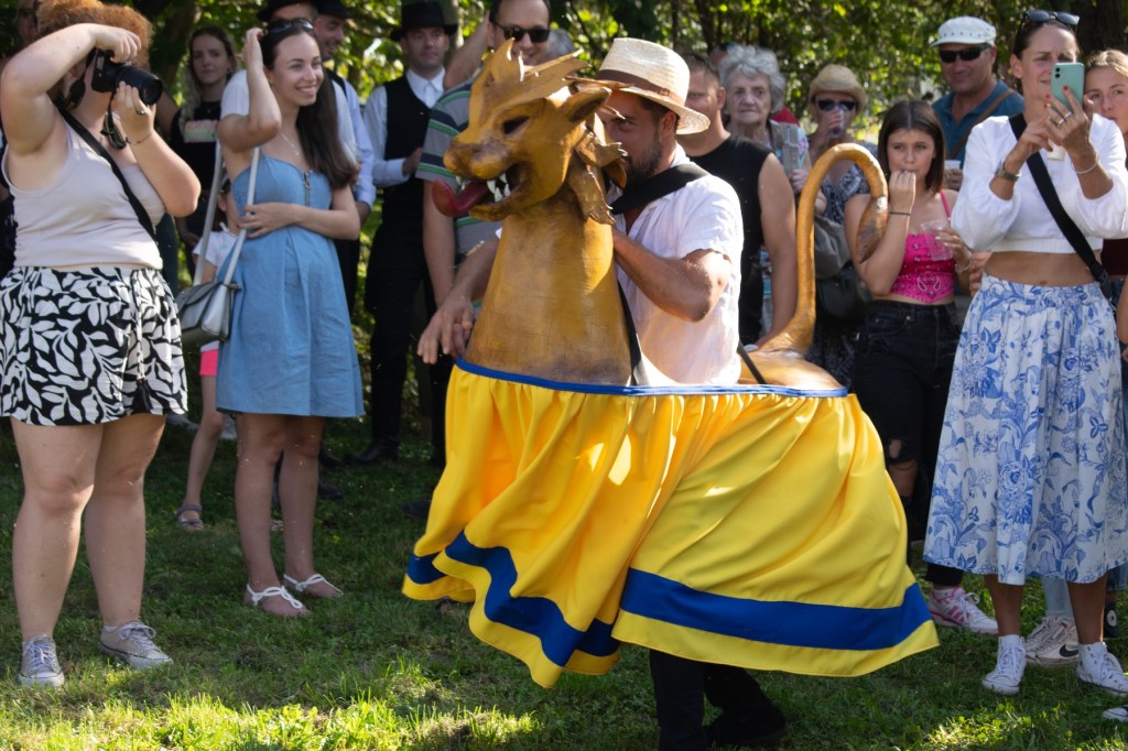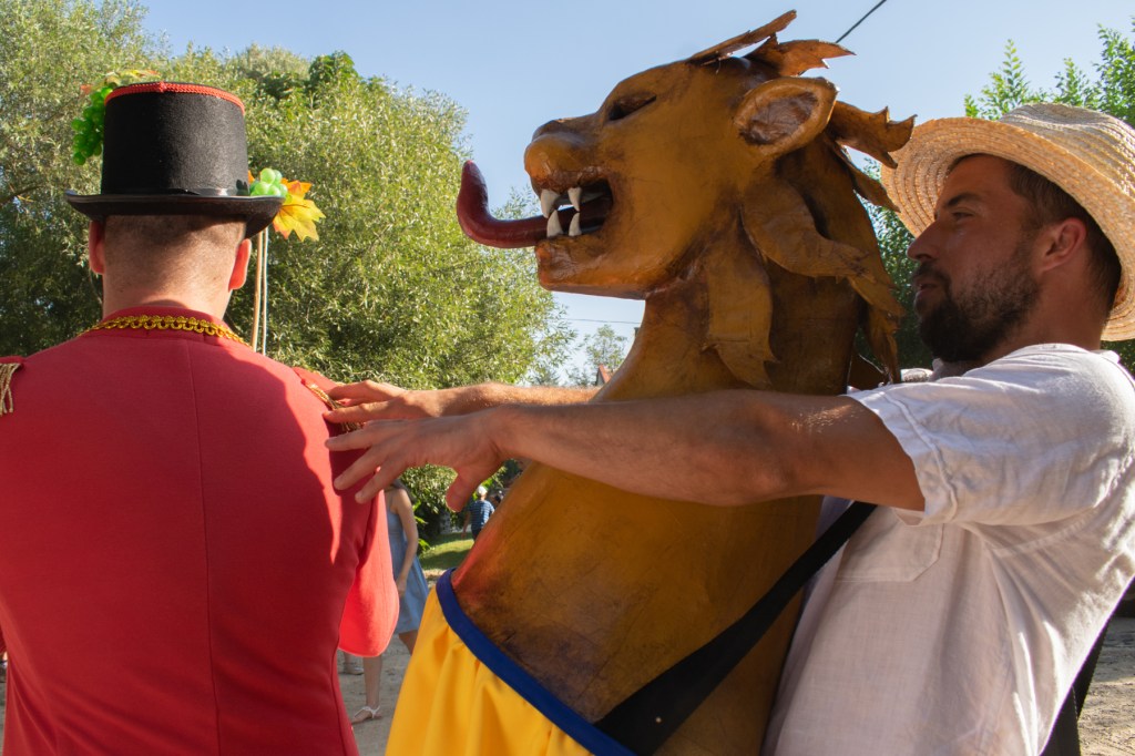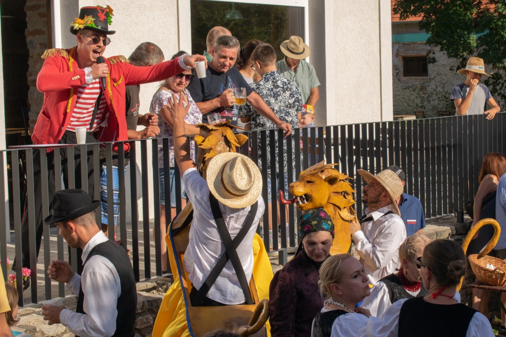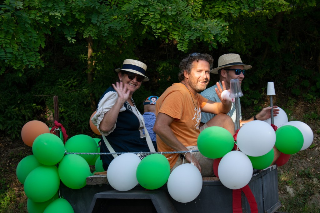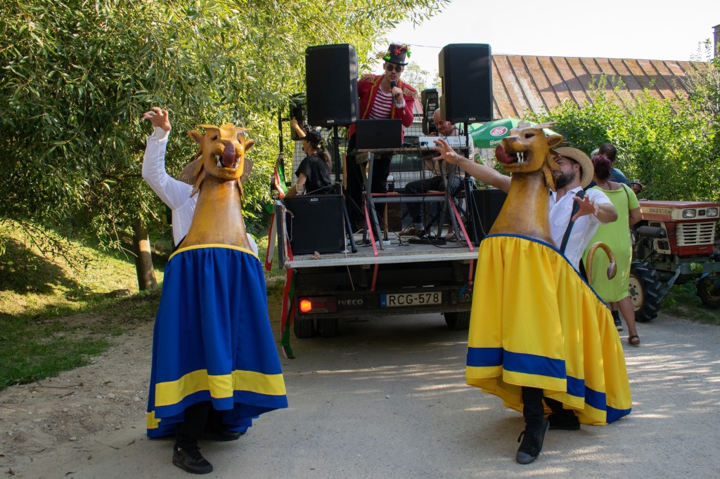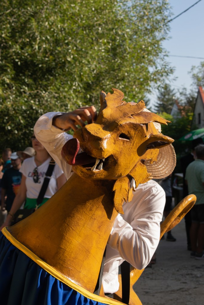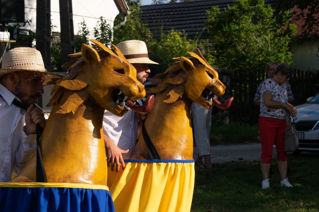 Talán már többen tudjátok, hogy bázisunk a Káli-medencében, Köveskál szomszédságában található zsákfalu, Balatonhenye. Itt a Pajta Programnak köszönhetően, a Veszprém-Balaton 2023 Európa Kulturális Fővárosa program részeként bábszínházi előadásokra, szakmai beszélgetésekre invitáltuk május óta a térség lakóit, és az éppen itt tartózkodókat. Ennek a lehetőségnek köszönhetően az idei szüreti felvonulásból is kivettük a részünket bábelőadással, erre az alkalomra készült bábokkal és a helyből, a településekből inspirálódó rigmusokkal. Köveskál és Balatonhenye évek óta együtt tartja szüreti felvonulását. A felvonuláson körülbelül harminc traktoros szállítja a résztvevőket, mind a két településen három-három megállóban kulturális műsorok, kínálóasztalok várják a közösséget és a végállomásnál természetesen vacsora.