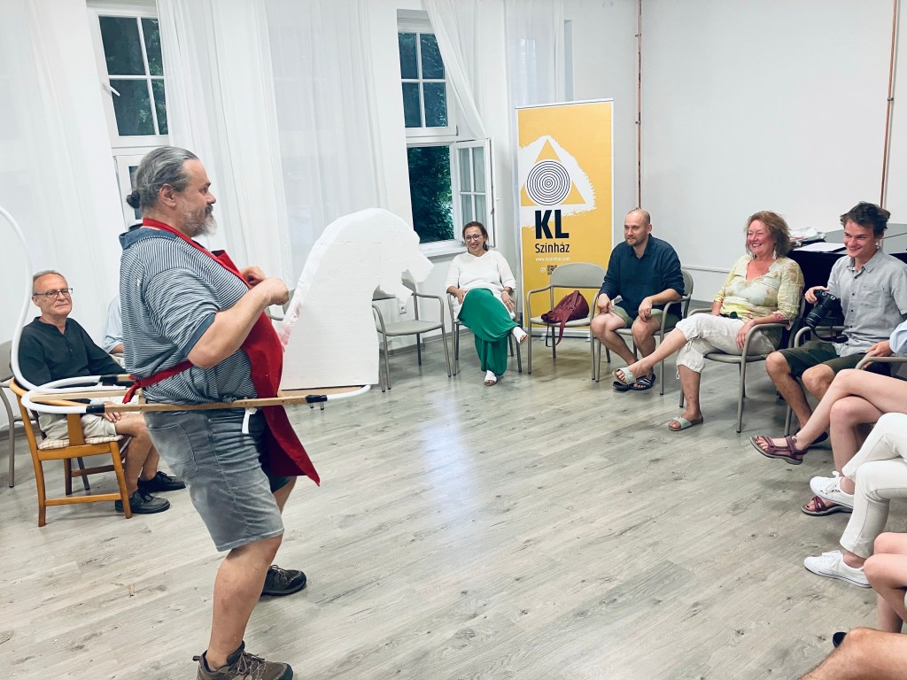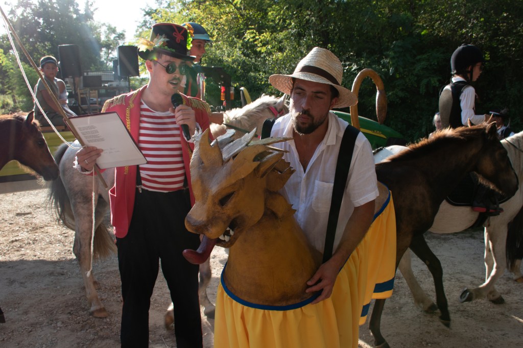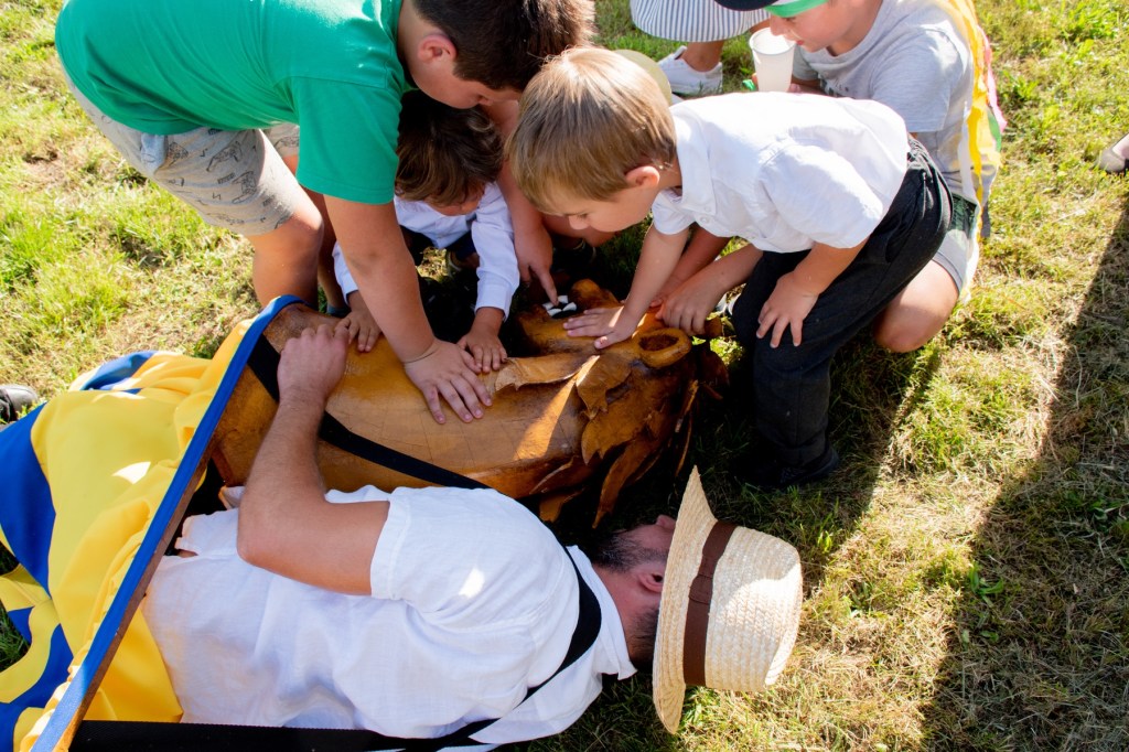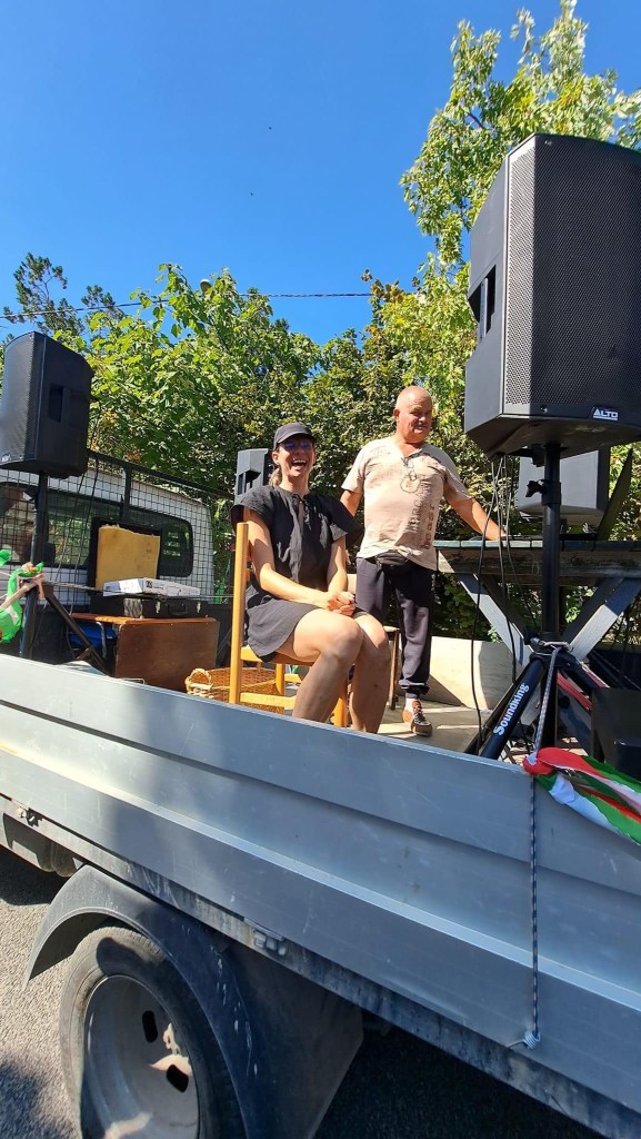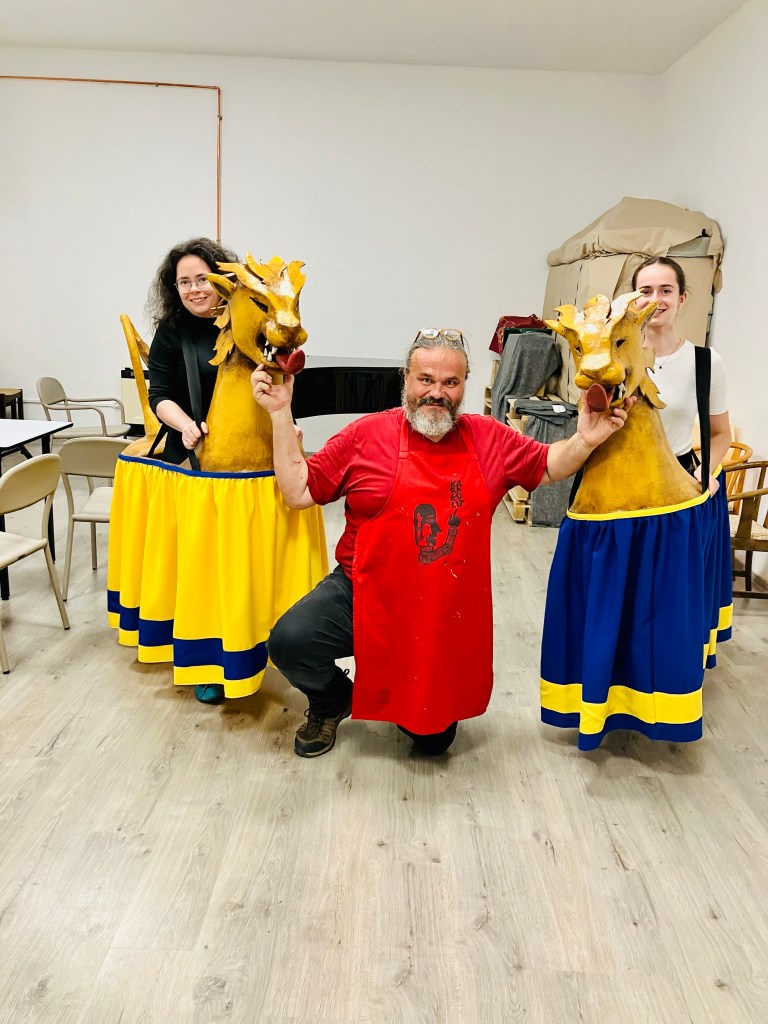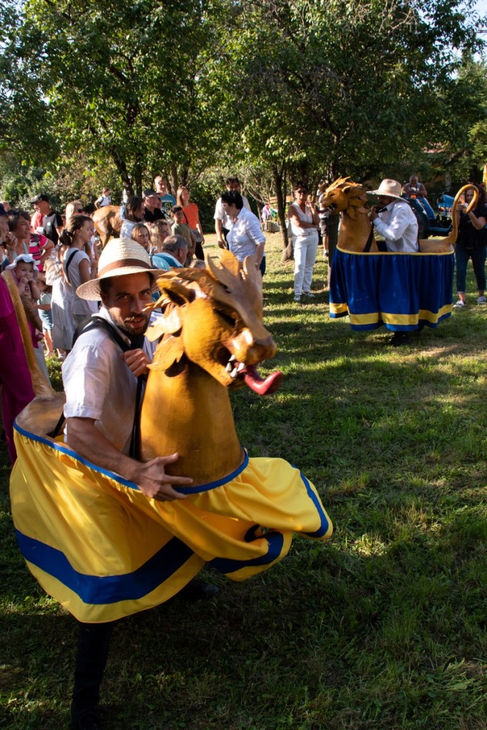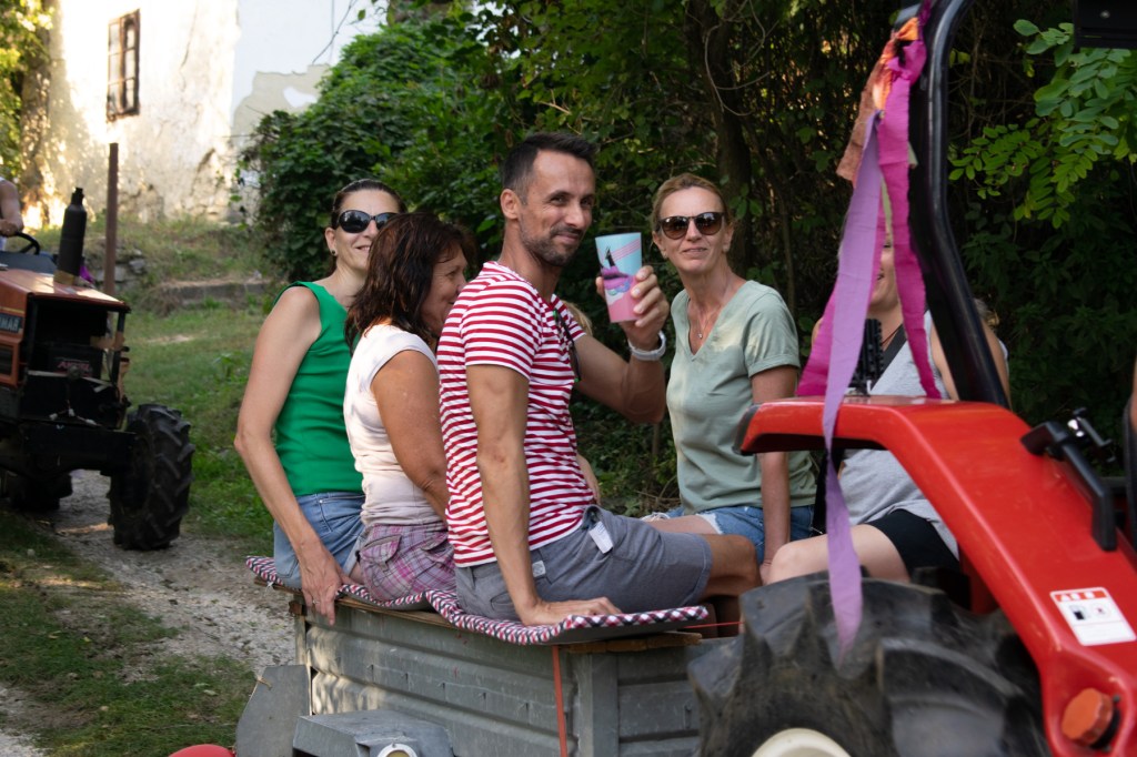 Talán már többen tudjátok, hogy bázisunk a Káli-medencében, Köveskál szomszédságában található zsákfalu, Balatonhenye. Itt a Pajta Programnak köszönhetően, a Veszprém-Balaton 2023 Európa Kulturális Fővárosa program részeként bábszínházi előadásokra, szakmai beszélgetésekre invitáltuk május óta a térség lakóit, és az éppen itt tartózkodókat. Ennek a lehetőségnek köszönhetően az idei szüreti felvonulásból is kivettük a részünket bábelőadással, erre az alkalomra készült bábokkal és a helyből, a településekből inspirálódó rigmusokkal. Köveskál és Balatonhenye évek óta együtt tartja szüreti felvonulását. A felvonuláson körülbelül harminc traktoros szállítja a résztvevőket, mind a két településen három-három megállóban kulturális műsorok, kínálóasztalok várják a közösséget és a végállomásnál természetesen vacsora.