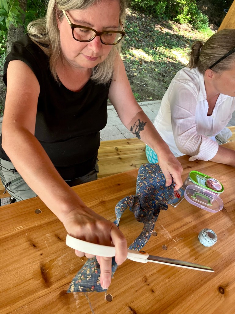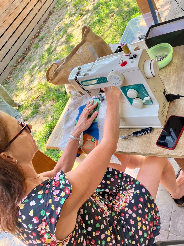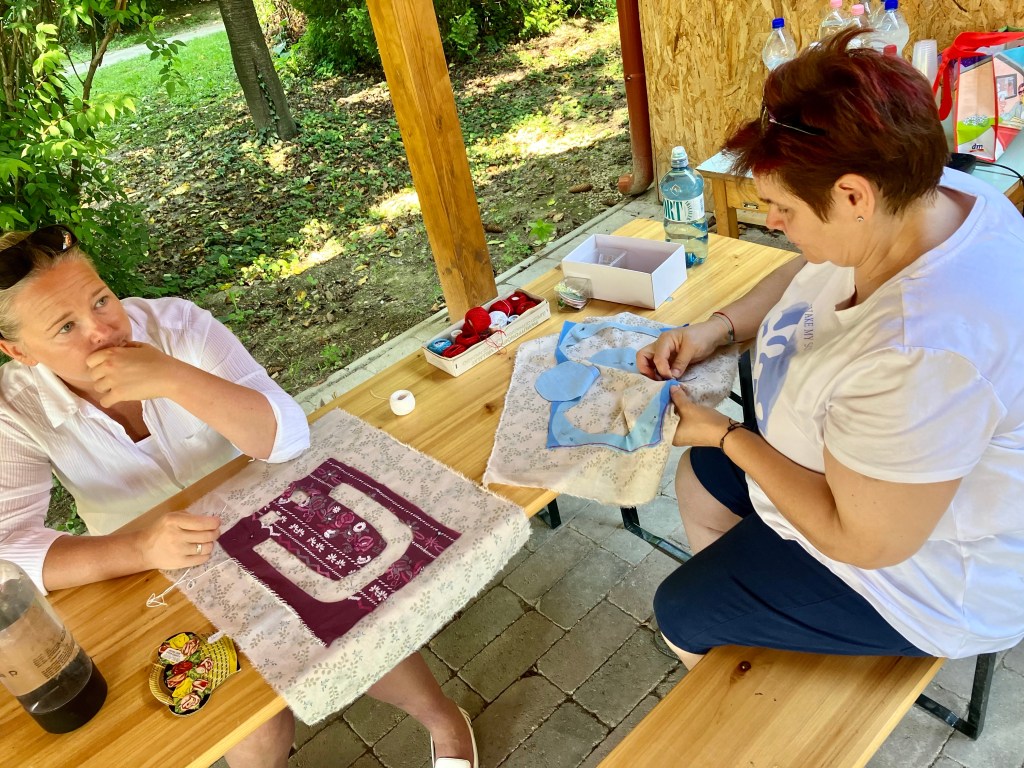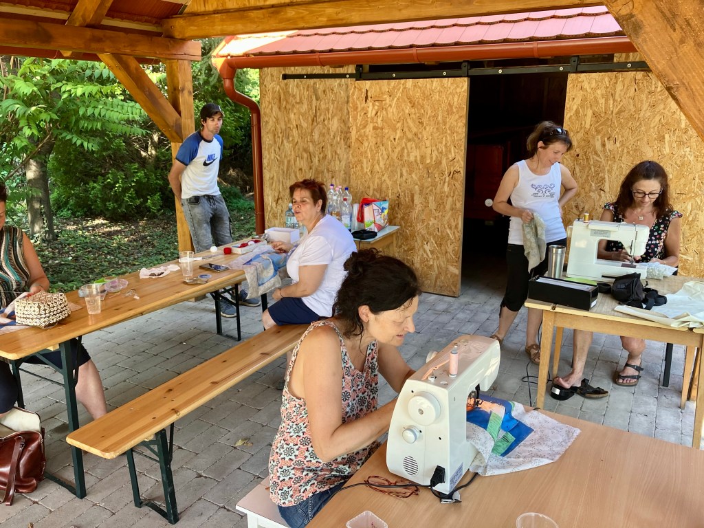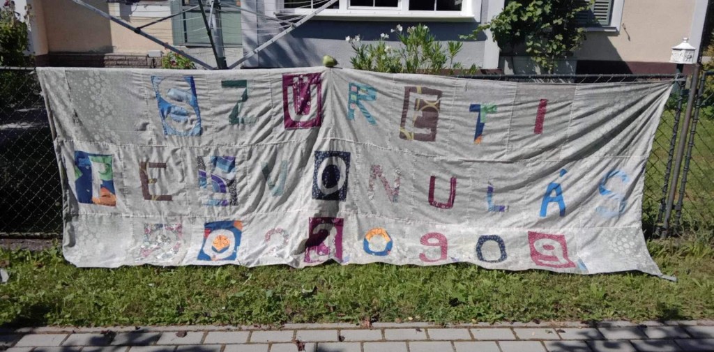 Az eseményt megelőzte egy kis közösségi varrás, hiszen szerettük volna, ha az erre járók és a helyiek jól eszükbe vésik a dátumot. Elhullott textíliából, már nem használt huzatból hat-hét szorgos kéznek és három varrógépnek köszönhetően el is készült a felvonulást hirdető patchwork felirat.