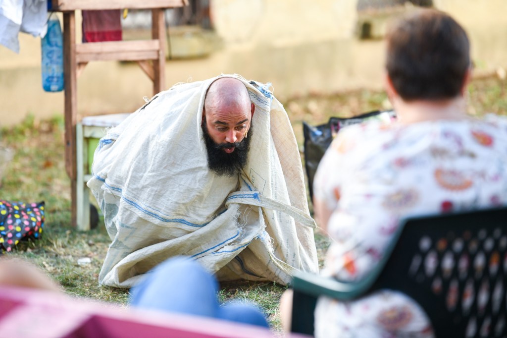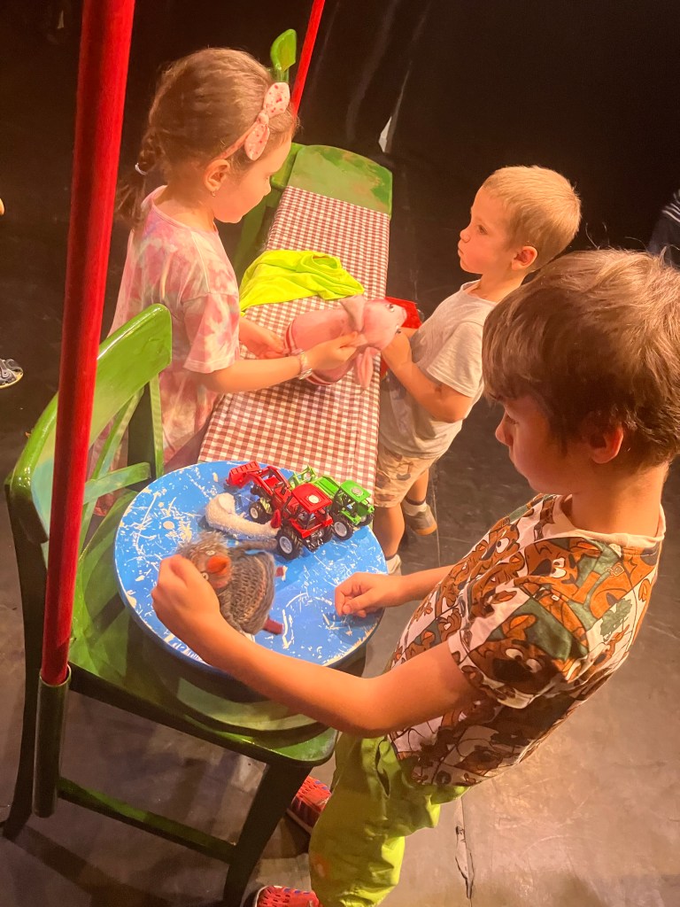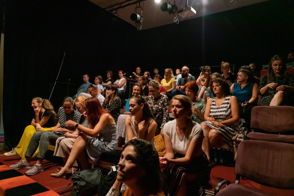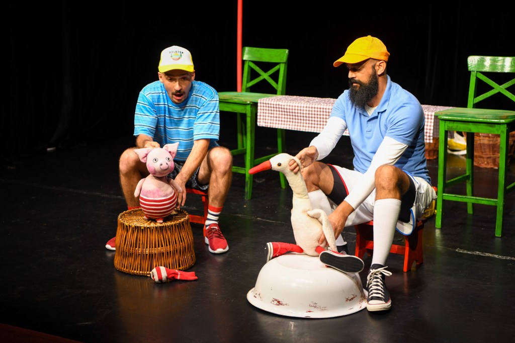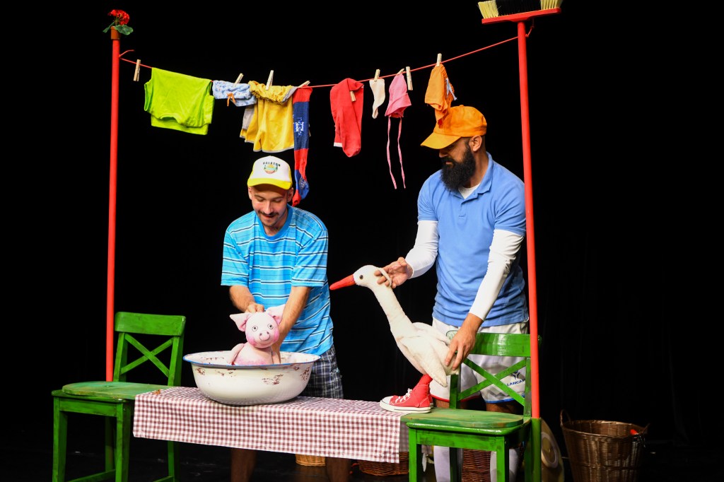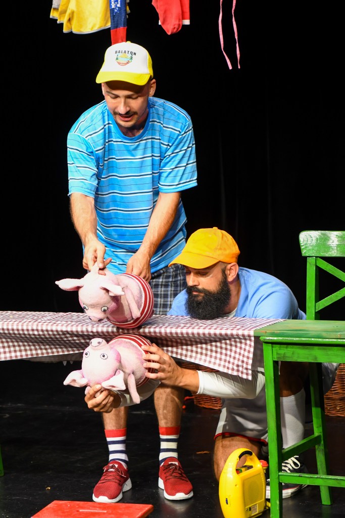 Miután a nézők teljesen megtöltötték a nézőteret, kezdetét vette a Tóth Krisztina könyvsorozata alapján íródott előadás. Cseri Hanna rendezése, Berta Csongor és Czéh Dániel játéka elvarázsolta a nézőket. “Nagyon meghitt, intim színházi tér volt, ahol játszottunk, ami a mi a előadásunk szempontjából tökéletes. A helyi technikusok nagyon profik és segítőkészek voltak, úgyhogy minden gördülékenyen ment.”– erősítette meg Dani benyomásait Csongor. A nézőtéren lehetett érzékelni, hogy a gyerekek mellett az apukákat meglepetésszerűen érte az előadás. A fiúk is érezték ezt. “Sok felnőtt nevetést hallottunk előadás közben. Egy férfi előadás után odajött és azt mondta, hogy ő bárhová elutazik szívesen, csakhogy lásson még más előadásokat is tőlünk. Szerintem erről ismerhető fel, ha valami minőségi, hogy az előadásnak van egy olyan rétege is, ami a felnőtteket is nívósan tudja szórakoztatni.”– mesélte Csongor. Az előadás után a gyerekekkel együtt pakoltunk el.