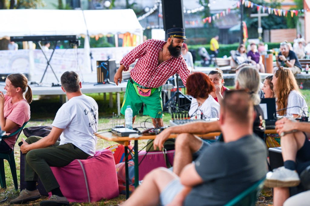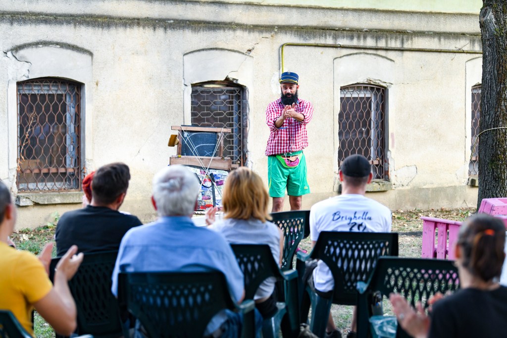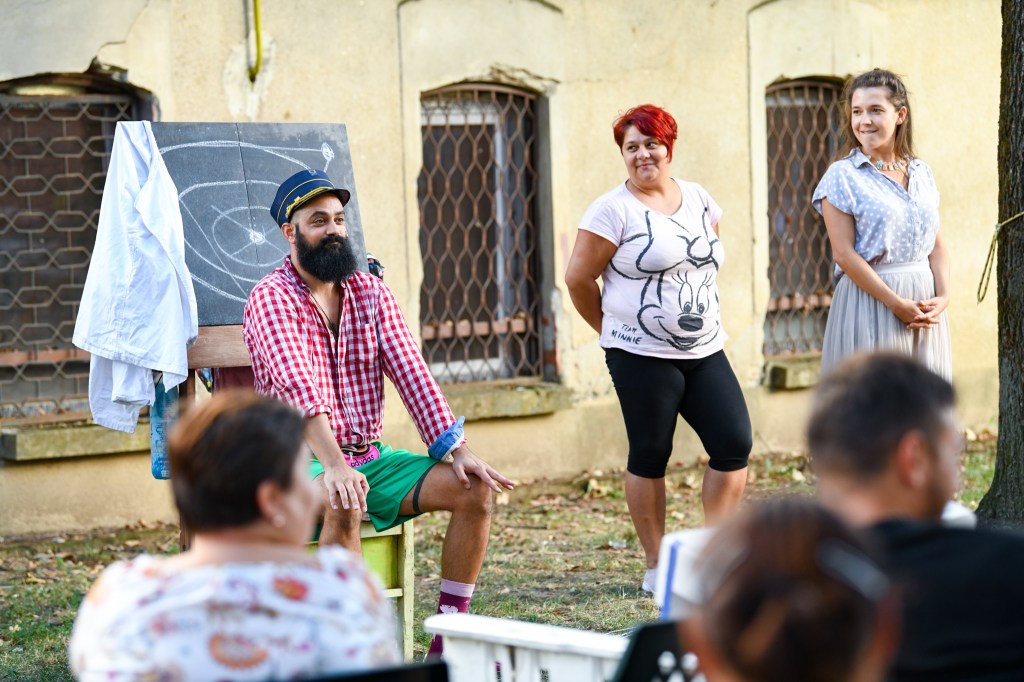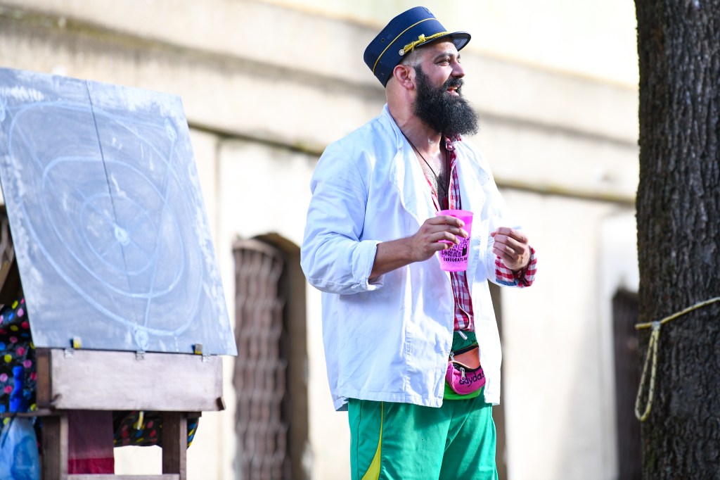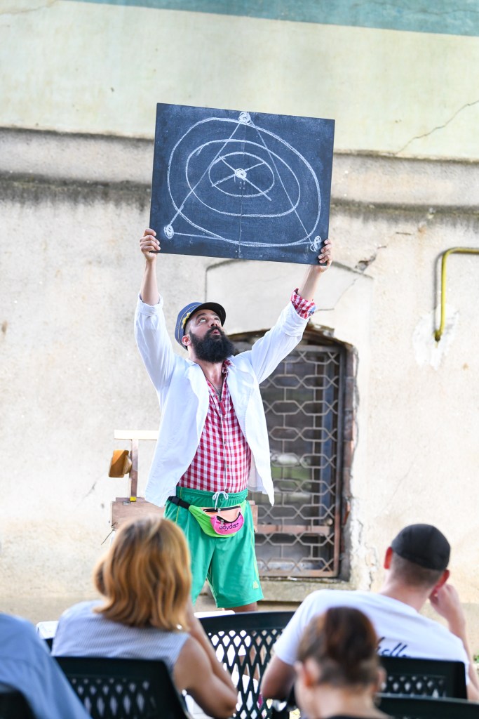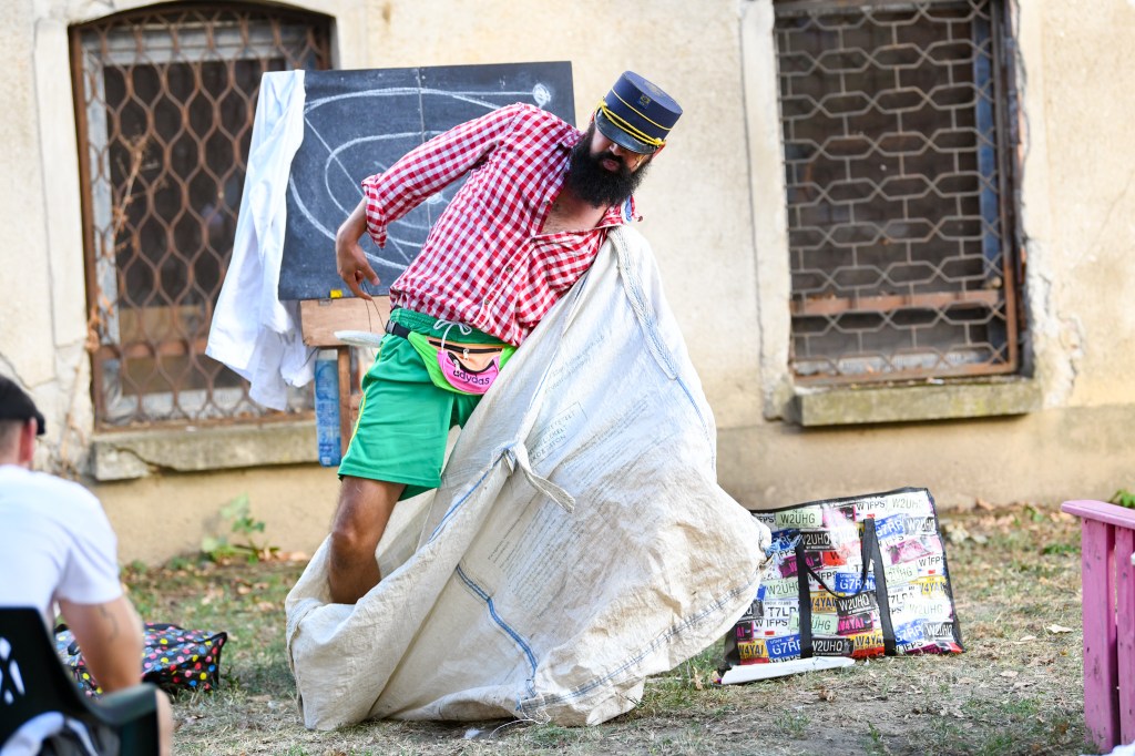 Másnap rengeteg időnk volt, így arra jutottunk, hogy nem ártana egy kicsit úrrá lenni a busz hátuljában uralkodó káoszon. Hát kipakoltunk és egy új rendszer szerint bepakoltunk. De a SÁRKÁNYÖLŐ SEBESTYÉN című előadásunk díszletét már a Tűzoltótoronyhoz vittük. Gyors bepakolás és hangpróba után, már játszottuk is a nyáron legtöbbet játszott előadásunkat. Délután már csak Czéh Dánielnek kellett tartania magában a lelket, hiszen A KISGÖMBÖC című egyszemélyesével szórakoztatta az egybegyűlt felnőtteket. “Egy színházhoz szokott közönséggel találkoztunk, akik sokat nevettek, reagáltak az előadásokra. A felnőttek különösen élvezték a bábelőadásokat, még a gyerekeknek szólókat is, sokat nevettek, és utána elismerő visszajelzéseket kaptunk. A Malac és Liba előadást követően sok olyan pozitív kritikával találkoztunk, amiben az apró poénokra, felnőtteknek szóló kikacsintásokra reagáltak a nézők.” – emlékszik vissza Dani.